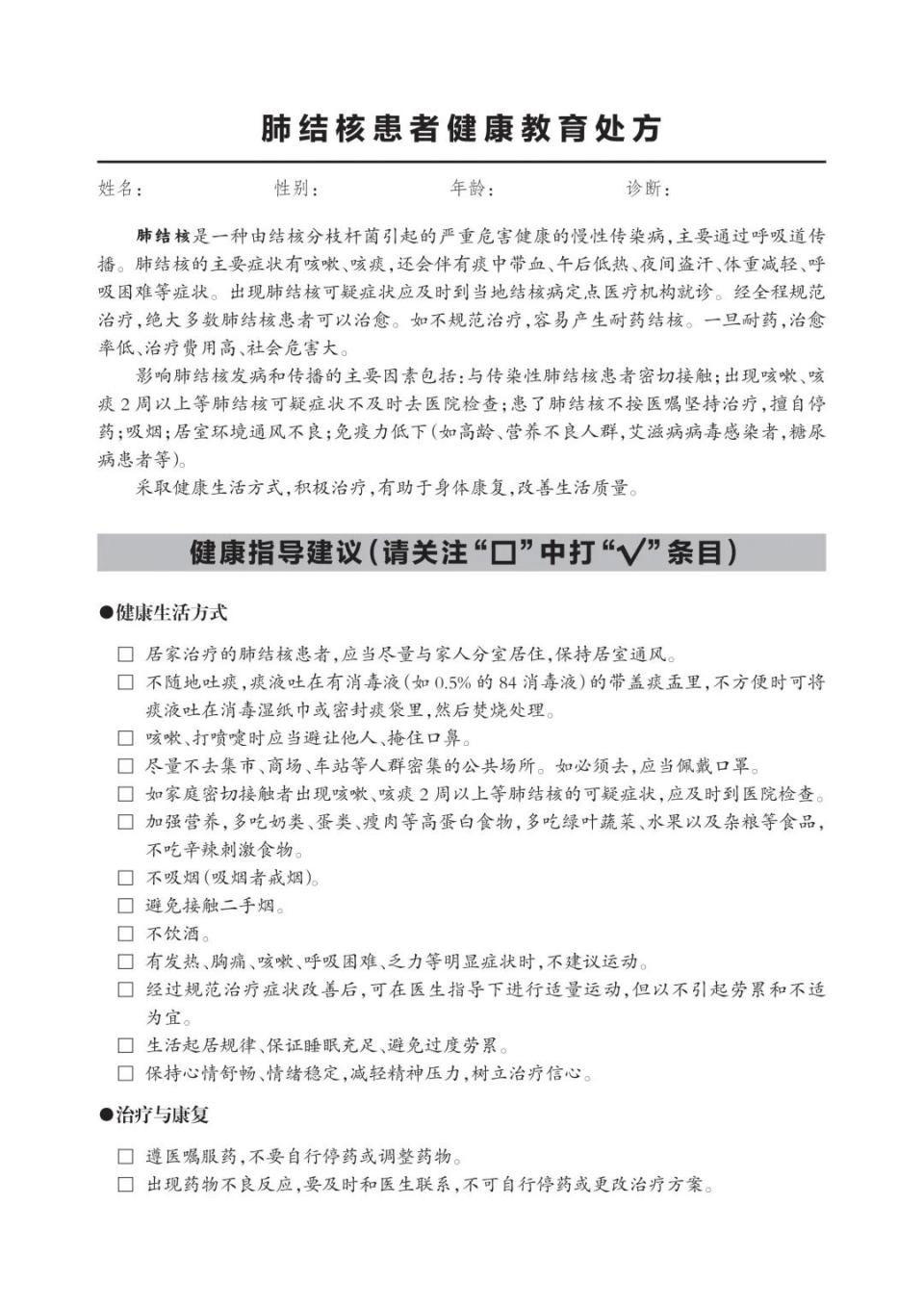 健康教育处方是一种有效的个体化非医疗干预手段,主要为基层医务人员提供适用、易操作的工具,引导基层医务人员科学、规范、有效、精准地提供健康教育服务。在诊疗时或随访时,医务人员根据患者具体情况勾选适宜条目,出具个体化的健康教育处方,并通过面对面讲解,指导患者遵医嘱治疗和做好日常健康管理,提升健康状况和生活质量,促进患者康复。