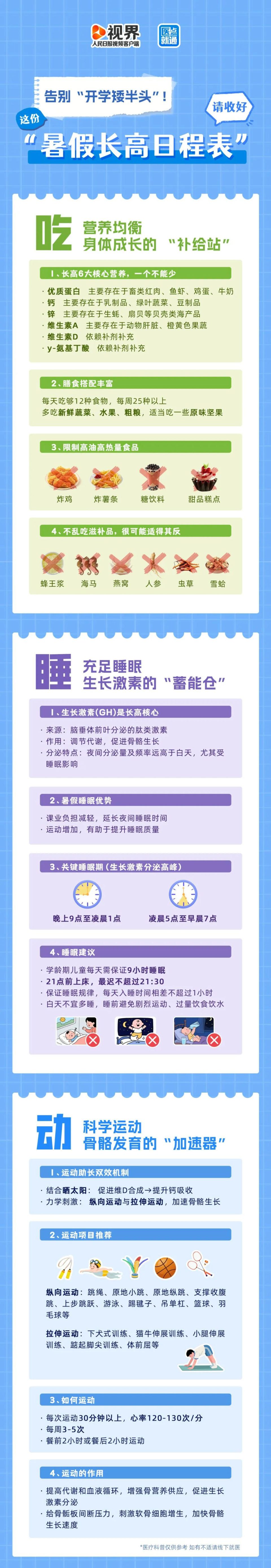 快收好这份“暑假长高日程表”!开学惊艳所有人! 想让孩子猛长个?暑期做好这3件事 吃 要营养均衡,补足蛋白质、钙和维生素等; 睡 要抓住生长激素分泌高峰,晚上9点到凌晨1点、凌晨5点到7点是关键期; 动要选跳绳、游泳、吊单杠等纵向运动搭配拉伸,每周3-5次、每次30分钟以上。