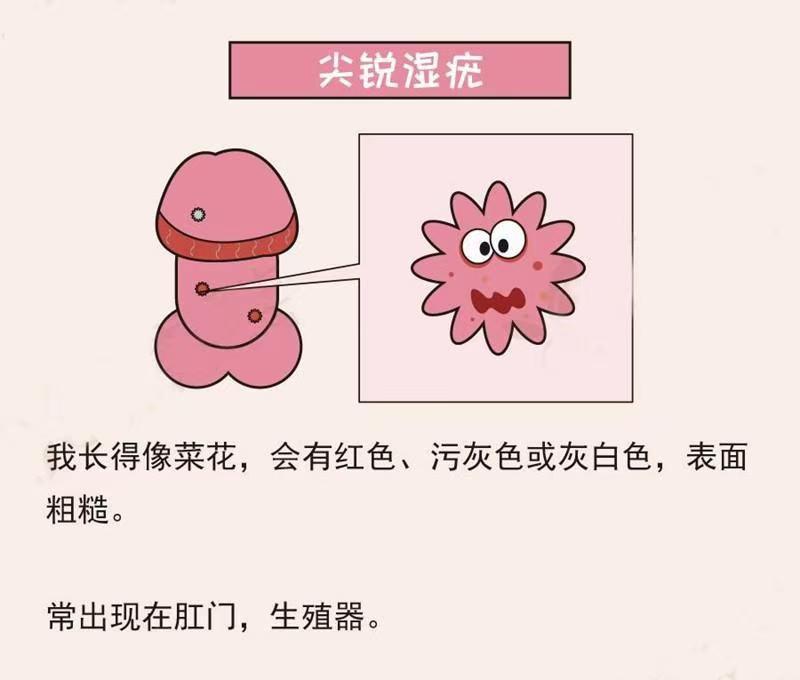 尖锐湿疣主要表现为皮肤上的疣状赘生物,通常出现在生殖器和肛门周围。初起时,疣体可能较小,随着病情发展,疣体会逐渐增大,表面可能变得凹凸不平,颜色可能为肤色、红色或灰色。多数患者无明显自觉症状,少数患者可能会感到疼痛或不适,有时还可能伴有其他症状,如分泌物增多、出血等。少数患者疣体过度增生成为巨大型尖锐湿疣(又称癌样尖锐湿疣),可发生恶变。