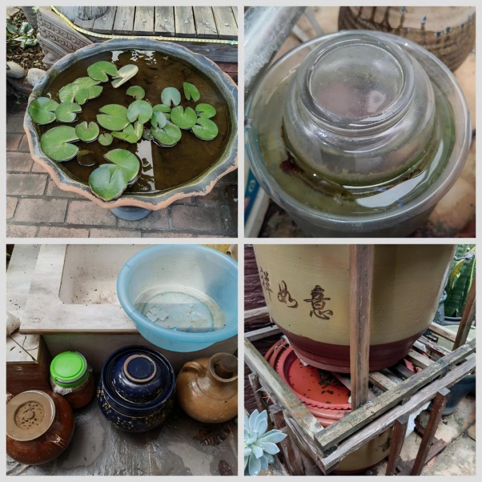 (三)天台、阳台及门前屋后积水管理。屋顶反墚、排水槽等应定期疏通,避免堵塞积水。阳台、天台、庭院内的花盆、泡沫箱、废弃瓶罐等容器应及时清理,闲置容器应倒扣放置,储水容器如水缸应加盖,废弃容器彻底清除。竹筒、树洞应进行封堵或改造,莲花池养鱼防蚊。空调冷凝水应及时排净,废弃轮胎在底部打孔或避免露天放置。下水井进行防蚊封堵,有条件的建议将明沟改为暗渠。