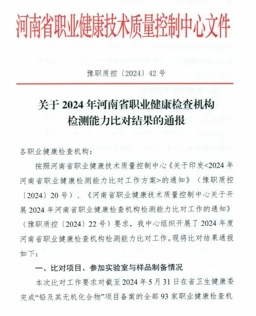 近日,从河南省职业健康技术质量控制中心处获悉,根据中国疾病预防控制中心职业卫生与中毒控制所给出的判定原则,三门峡市疾病预防控制中心血中铅含量的测定检测能力比对结果被评定为“优秀”。